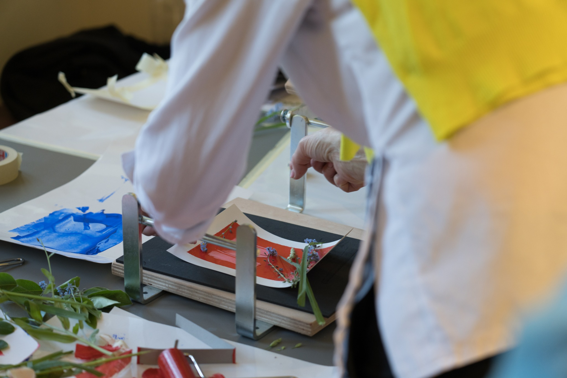 Kūrybinės dirbtuvės, kurių metu raižomas A5 formato linoleumas ir daromas jo antspaudas ant popieriaus.